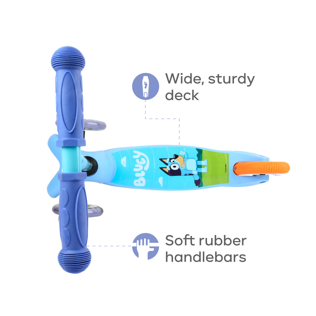 Create long-lasting memories with the Bluey 3-Wheel Tilt and Turn Light Up Wheel Scooter. The scooter is designed for children ages three to five to begin developing their motor skills as well as strength and coordination. The three-wheel design helps your child balance easily with a simple tilt-and-turn steering system. The deck is wide and sturdy and features a rear foot brake so they can build up their confidence and you can have ease of mind as they explore the world.