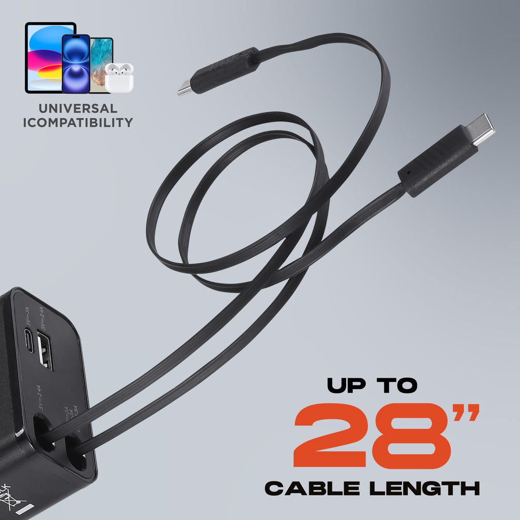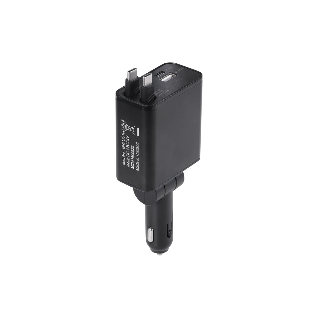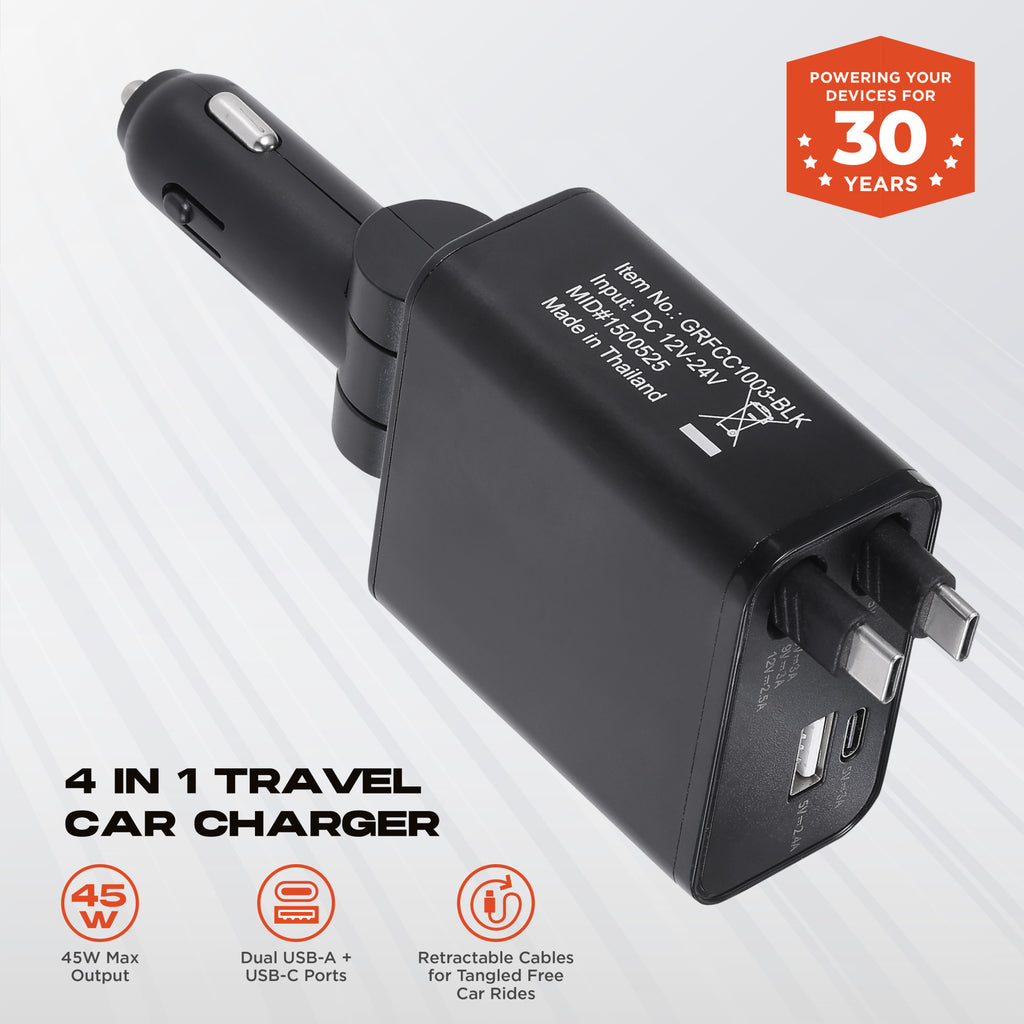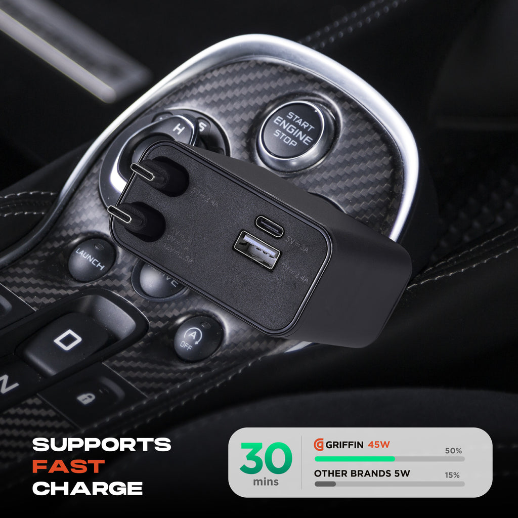 Simplify on-the-go charging with the Griffin PowerJolt 4-in-1 Travel Car Charger. This compact yet powerful charger delivers up to 45W of total output through dual USB-C and USB-A ports, supporting fast charging for phones, tablets, GPS units, and more. Designed with convenience in mind, it includes two retractable USB-C cables that extend up to 28 inches—keeping your car organized and your devices within reach. Whether you're commuting or road-tripping, the charger ensures your gear stays powered without cable clutter. Universally compatible and travel-optimized, this charger is built for durability and backed by Griffin’s limited lifetime warranty.