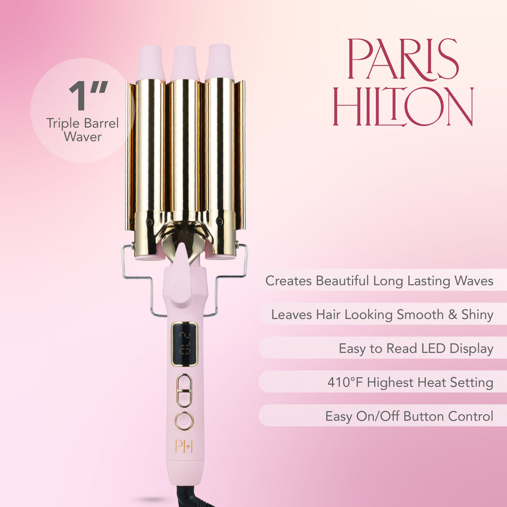 Achieve glamorous, beach-inspired waves with the Paris Hilton BeachBreeze 1” Triple Barrel Waver. Designed with titanium barrels and advanced heating technology, this styling tool delivers even heat distribution to reduce frizz and enhance shine, leaving hair smooth and silky. With a maximum heat setting of 410°F, it quickly creates defined, long-lasting waves suitable for all hair types. The easy-to-read LED digital display ensures precise temperature control, while the 360° swivel cord allows for effortless, tangle-free styling at any angle. For added safety, the waver features a 1-hour auto shut-off, giving you peace of mind during use. Compact and stylish, the BeachBreeze combines professional performance with Paris Hilton’s signature design, making it the perfect tool for creating voluminous, beach-ready waves at home or on the go.